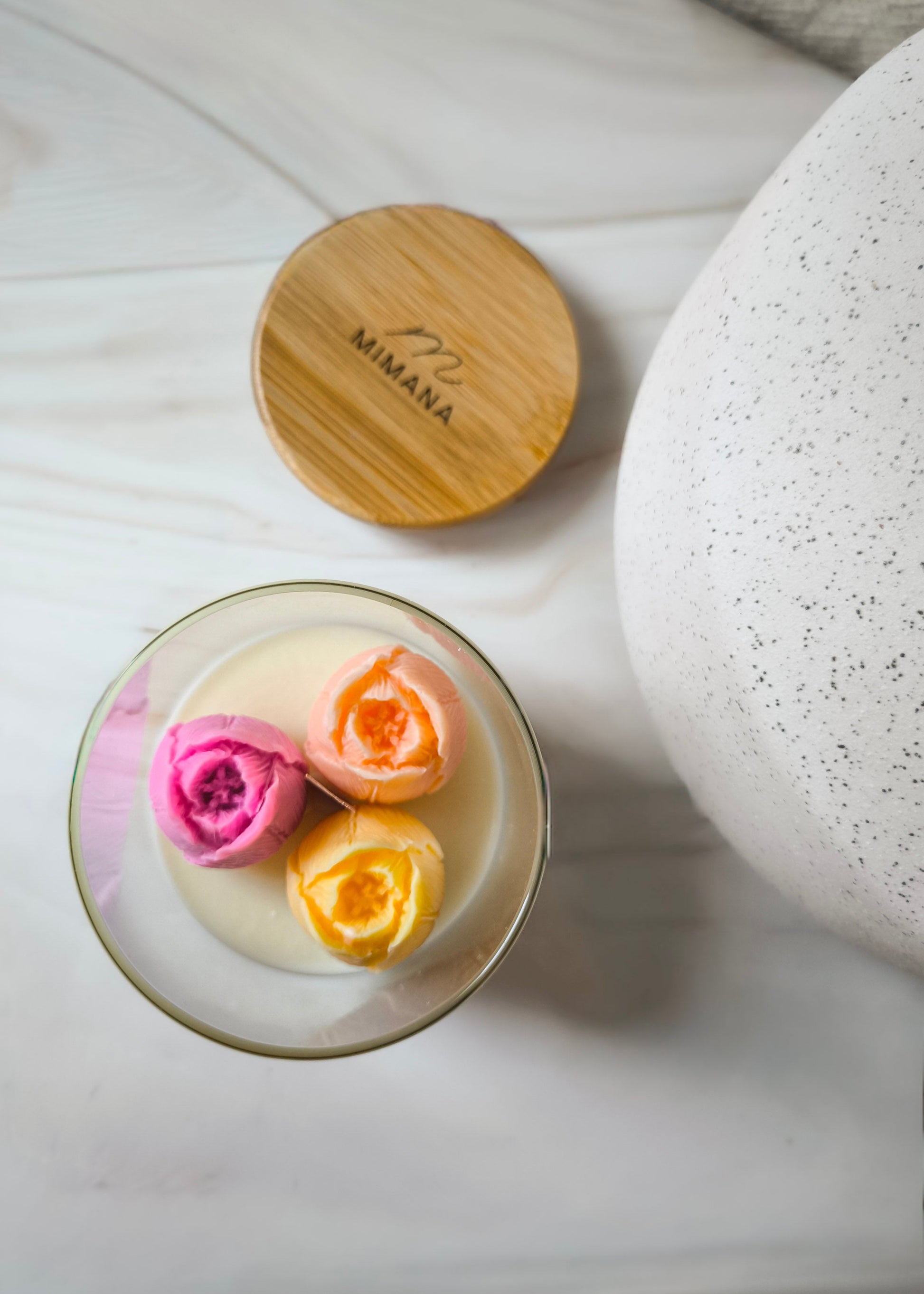 Mimana Kerzen werden mit einem sauber brennenden Sojawachs und Duftöl Mischungen hergestellt. Sie enthalten kein Paraffin, Petroleumprodukte oder tierischen Wachsgehalt.